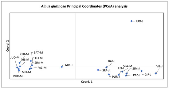 A principal coordinate analysis revealed that the mature cohorts of A. glutinosa are more similar among themselves than juvenile cohorts of the same population (Figure 2), forming a tight separate cluster. The only exception is SPA-M, which is clustered close to SPA-J in the vicinity of the juvenile cohorts. The JUO-J differs from all the other analysed populations, as well as from the JUO-M.