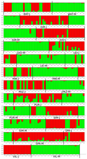 Very similar results were obtained after the STRUCTURE analysis (Figure 3). It revealed that two clusters of individuals are most likely to exist (K = 2; Supplement File S3), as determined by DeltaK [46]. Mature and juvenile cohorts in the STRUCTURE analysis histogram are grouped into different clusters, with only some admixed individuals (Figure 3).