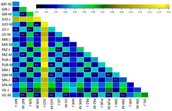 Heat map of pairwise FST values among all A. glutinosa populations and age cohorts. n.s.: no statistical significance.