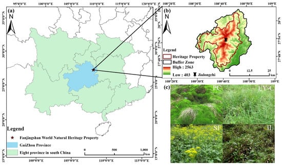 The Fanjing Mountain World Natural Heritage Property (27°45′6′′–28°3′10′′ N, 108°30′41′′–108°47′51′′ E) is located at the junction of Yinjiang, Jiangkou, and Songtao counties in Guizhou Province (Figure 1a), in the transition zone from the Yunnan-Guizhou Plateau to the hills of western Hunan Province. The total area of Fanjing Mountain Heritage Property is 775 km2, with the highest peak elevation of 2570.5 m and the relative height difference of the mountain body of more than 2000 m. The area belongs to the subtropical monsoon climate zone, with prominent characteristics of a humid central subtropical monsoon mountain climate, with an annual average temperature of 9.2–16.9 °C [41], an annual average relative humidity of 78%–79%, and an annual average precipitation of 1080–2500 mm, with precipitation mainly concentrated in April–October [42]. The vegetation has significant vertical differentiation, and the vegetation in the area is well-preserved and native [7]. It can be divided into five vertical zones from the foothills (500 m) to the summit, with about 3724 existing plants; among them, there exist 791 species of bryophytes belonging to 74 families (https://whc.unesco.org/en/list/1559 (accessed on 26 January 2023)).