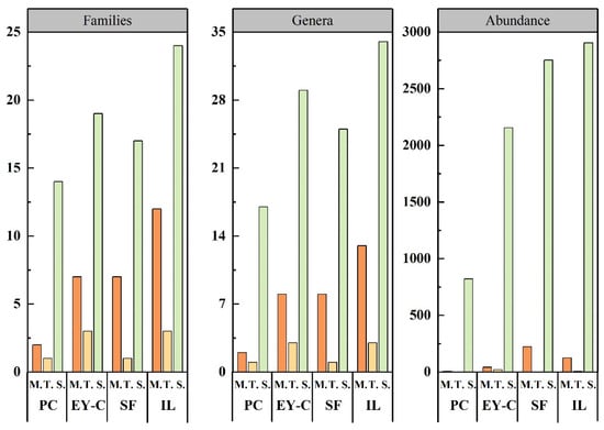 Differences in the number of families, genera, and abundance of moss mites at the order level in different vegetation succession habitats. Notes: PC: Polytrichum commune Hedw., EY-C: Eleocharis yokoscensis (Franch. et Sav.) Tang et-Cypers sp., SF: Senecio faberii Hemsl, IL: Indocalamus longiauritus Hand.-Mazz., M: Mesostigmata, T: Trombidiformes, S: Sarcoptiformes.