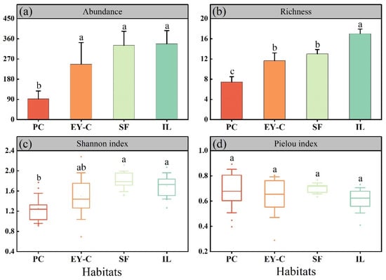 Abundance (a), richness (b), Shannon diversity (c), and Pielou index (d) of moss mites communities in different vegetation successional habitats. Notes: PC: Polytrichum commune Hedw., EY-C: Eleocharis yokoscensis (Franch. et Sav.) Tang et-Cypers sp., SF: Senecio faberii Hemsl, IL: Indocalamus longiauritus Hand.-Mazz. The different lowercase letters indicate significant differences at the p = 0.05 level.