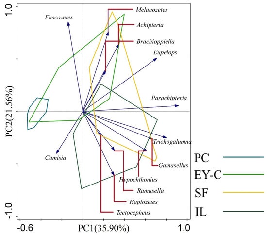 A total of 13 moss mites species with relative abundance greater than 1% were selected for PCA analysis (Figure 5, Appendix D), accounting for 90.67% of the total number of individuals, with Axis 1 and Axis 2 explaining 35.9% and 21.56% of the total variance, respectively, cumulatively explaining 57.46% of the variance, with significant differences in moss mite community composition among the four plant communities. The mites community composition of the PC habitat differed from that of the SF and IL habitats, respectively, and there was a clear separation. The Parachipteria, Trichogalumna, Gamasellus, Hypochthonius, and Eupelop taxa were the main taxa separated from the PC1 axis, and the Melanozetes, Acipteria, Fuscozetes, Haplozetes, and Brachioppiella taxa were the main taxa separated from the PC2 axis. Meanwhile, moss mites with relative abundance greater than 1% were mainly concentrated in IL and SF habitats, while PC was the least distributed habitat.