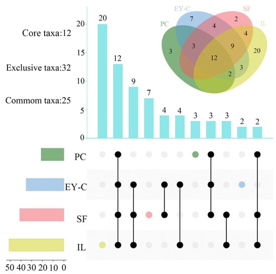 Core, exclusively common, genera of moss mites in different vegetation succession habitats. Notes: PC: Polytrichum commune Hedw., EY-C: Eleocharis yokoscensis (Franch. et Sav.) Tang et-Cypers sp., SF: Senecio faberii Hemsl, IL: Indocalamus longiauritus Hand.-Mazz. Above is a Venn diagram of the moss mites communities’ composition; the different colored circles indicated the different plant communities of moss mites. Below is the UpSet diagram. The different colored circles indicate the number of exclusive genera of mites in that flora. Black circles with connecting lines indicate the presence of the same genera between flora and the rest of the flora, and the bar graph above shows the number of the same genera.