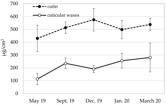 Cutin also showed the lowest coverage in the young leaves in May (429.7 μg/cm2) and increased steadily in September and December when the highest value was attained (575.4 μg/cm2), after which a small decrease was observed (Figure 2). The seasonal variation in the cutin deposited in the cuticle of the cork oak leaves was statistically significant (p = 0.032), with the January value being significantly different from the December and March values.