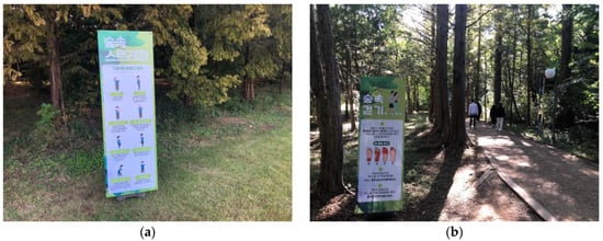Example of a self-guided forest healing program guideboard. (a) stretching; (b) walking.
