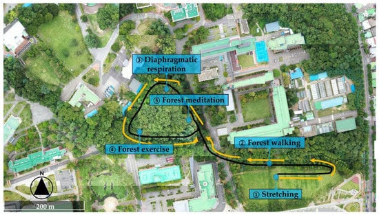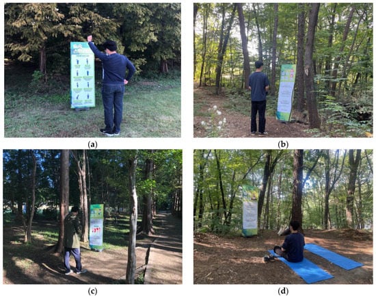 For the subject to carry out a self-guided forest healing program, we installed a guideboard on forest therapy activities within the campus forest of Chungbuk National University for each section. The installed guideboard of forest therapy activities presented the implementation guidelines for stretching, diaphragmatic respiration, walking, and exercise (Figure 2). Details are shown in Appendix A. The self-guided forest healing program encouraged the subject to voluntarily engage in forest therapy activities by watching and following the signs of forest therapy activities installed while walking on the 1.4 km trail (Figure 3). The subjects spent 60 min freely moving through the designated route in the campus forest, looking at the installed guideboards, and following the activities. The supervisor at the field only guided the route of the self-guided forest healing program. The guided forest-healing program was conducted under the guidance of a forest healing instructor. To avoid the difference in ability between guides, all guided forest-healing programs were led by the same forest healing instructor (Figure 4). The self-guided and guided forest-healing programs were carried out with the same route and activities (Figure 5). The only difference between the two types of forest healing programs was the method of delivering forest therapy activities. Routine activities without any intervention did not receive any forest healing program, and only psychological evaluations of daily activities were conducted. The psychological evaluation of the subjects was conducted after each intervention by the supervisor in the field. All subjects conducted a total of three psychological evaluations.