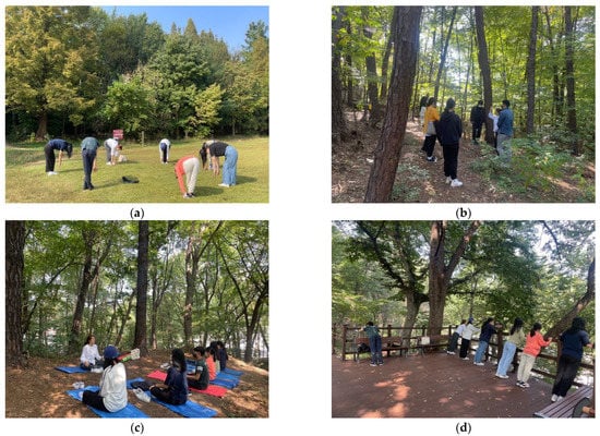 The guided forest-healing program. (a) stretching; (b) diaphragmatic respiration; (c) meditation; (d) exercise.