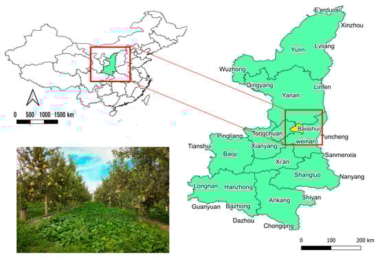 This experiment was carried out over three years from March 2018 to December 2020 in the apple orchard in the Weibei Dryland Experimental Station of the Northwest Agriculture and Forestry University at (35°21′ N, 109°56′ E; 838 m above sea level), Baishui County, Shaanxi Province, China. This apple orchard has been a study site for 12 years (Figure 1). According to the USDA’s soil classification method, the experimental soil type, silty loam, which contains 67% silt, 25% clay, and 8% sand, was categorized as haplustalfs (Table 1). The experimental crop was established in 2005 with Fuji apple trees (Malus domestica Borkh). The trees had a density of 1200 plants ha−1 [,], the region had no irrigation system, and rainfall was the only water resource for agriculture.