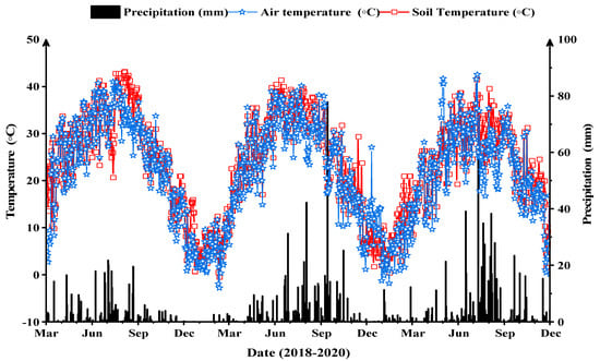 Seasonal dynamics of precipitation (mm) and soil temperature. ✩ Blue: air temperature, ☐ red: soil temperature (20 cm depth, °C) in the studied apple orchard from 2018 to 2020.