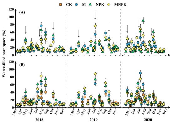 Seasonal dynamics of soil WFPS contents across the sampling sites and treatments from 2018 to 2020. (A) FD: fertilizer ditches WFPS, (B) BS: bare soil WFPS, CK: control, M: organic manure, NPK: chemical fertilizer, MNPK: chemical fertilizer combined with organic manure. The data points indicate the means of four replicates, and the error bars indicate the standard error (±SE). The black arrows represent the date of fertilizer application.