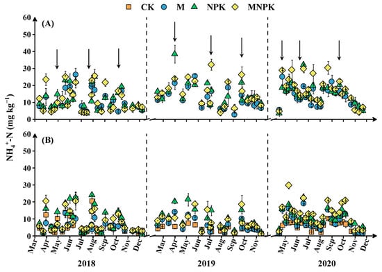 Seasonal dynamics of soil NH4+-N contents across all treatments from 2018 to 2020. (A) FD: fertilizer ditches, (B) BS: bare soil, CK: control, M: organic manure, NPK: chemical fertilizer, MNPK: chemical fertilizer combined with organic manure. The data points indicate the means of the four replicates, and the error bars indicate the standard error (±SE). The black arrows represent the date of fertilizer application.