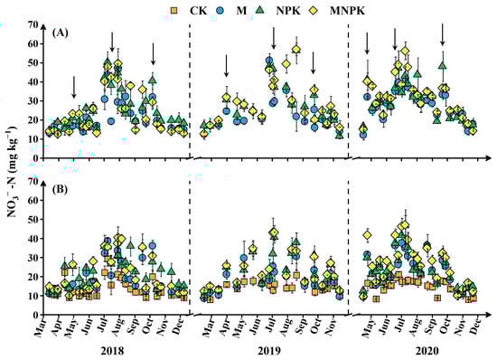 Seasonal dynamics of soil NO3−-N contents across all treatments from 2018 to 2020. (A) FD: fertilizer ditches, (B) BS: bare soil, CK: control, M: organic manure, NPK: chemical fertilizer, MNPK: chemical fertilizer combined with organic manure. The data points indicate the means of the four replicates, and the error bars indicate the standard error (±SE). The black arrows represent the date of fertilizer application.