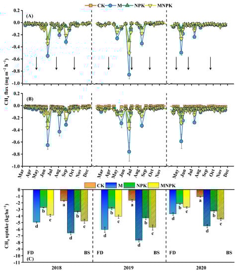 Variation in CH4 fluxes under different treatments. (A) FD: Fertilizer ditches, (B) BS: Bare soil sites, (C) annual cumulative CH4 uptake from different treatments. CK: control, M: organic manure, NPK: chemical fertilizer, MNPK: chemical fertilizer combined with organic manure. The data points indicate the means of the three replicates. The error bars indicate the standard error (±SE), and the black arrows indicate nitrogen fertilizer applications, the difference in lowercase letters indicate significant differences between the treatments (p < 0.05).