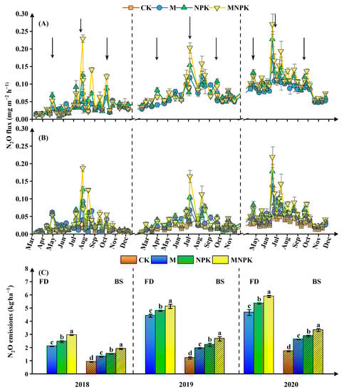 Seasonal variations in N2O flux across the sampling sites and treatments. (A) FD: Fertilizer ditches, (B) BS: bare soil sites, (C) annual cumulative N2O emissions from different treatments. CK: control, M: organic manure, NPK: chemical fertilizer, MNPK: chemical fertilizer combined with organic manure. The data points indicate the means of the three replicates, the error bars indicate the standard error (±SE), and the black arrows indicate nitrogen fertilizer applications. The difference in lowercase letters indicate significant differences between the treatments (p < 0.05).