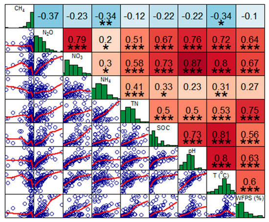 Correlations between GHG emissions and soil properties. N2O: nitrous oxide, CH4: methane, NO3−-N: nitrate nitrogen, NH4+-N: ammonium nitrate, TN: total nitrogen, SOC: soil organic carbon, T: soil temperature, WFPS: water-filled pore space. Significance levels: * 0.05, ** 0.01, *** 0.001. Negative correlations are highlighted in blue, and positive correlations are highlighted in red. A richer color indicates a stronger correlation. Dark blue indicates linear correlation.