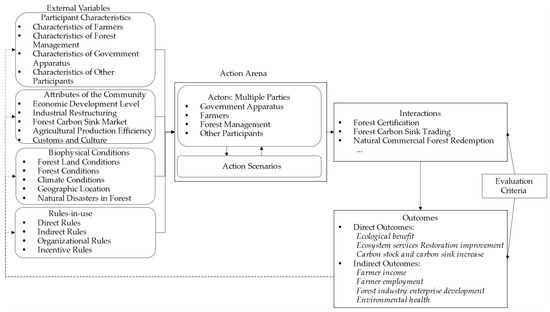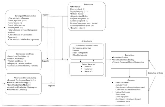 The influencing factors and outputs of the participation of multiple parties in NFPR are shown in Figure 3. The participating behavior of multiple parties in NFPR is mainly related to four groups of external variables: multiple participant characteristics, biophysical conditions, attributes of the community, and rules-in-use, and there are various specific variables in each external variable. Multiple participant characteristics include characteristics of farmers, forest management, government apparatus, and other participating parties; biophysical conditions include forest land conditions, forest conditions, climate conditions, geographic location, and natural disasters in the forest; attributes of the community include economic development level, industrial restructuring, agricultural production efficiency, forest carbon sink market, and customs and culture; rules-in-use include direct rules, indirect rules, organizational rules, and incentive rules. These influencing factors constitute the action space for multiple parties to participate in NFPR in different action scenarios. In the different scenarios, the multiple parties, under the supervision of evaluation criteria, make rational choices of forest certifications, carbon sink trading, natural commodity forest redemption, etc., to directly influence ecological benefits, ecosystem service restoration improvement, carbon storage, and carbon sink increase, as well as to indirectly influence farmers’ income, farmer employment, forest enterprise development, and environmental health.