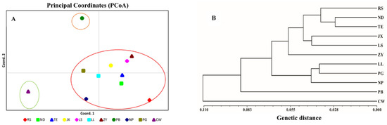 29] software was used to draw the dendrogram with Nei’s genetic distance based on the unweighted group average method (UPGMA). To further confirm genetic discontinuities, structure, and cluster analysis, principal coordinate analysis (PCoA) was performed using GenAlEx6.5.
