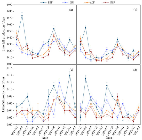 We noticed that all the forest communities in Figure 2 made significant contributions to litterfall production, and the change trend of the total amount of litterfall in each community was basically consistent with that of fallen leaves (Figure 2a,b). Among them, the leaves of EBF, ACF and RYF showed a bimodal pattern, with the highest peak in spring and the second peak in autumn (October); on the contrary, the DBF had the highest peak in autumn, and the second peak was in early spring in March (Figure 2b). It can be seen from Figure 2c that the highest peak of fallen branches in the EBF occurred in January (0.14 ± 0.01 t/ha), that the second peak was in autumn (October), and both appeared in autumn. The highest peaks of EBF and DBF appeared in spring in April and May, and the second peak was in August (0.11 ± 0.01 t/ha, 0.07 ± 0.01 t/ha). October was the highest peak month for ACF and RYF, and May was the second peak month.