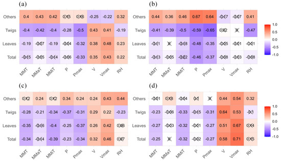 Correlation analysis of litterfall production and components with meteorological factors in four forest community types (a–d). (a): evergreen broad-leaved forest; (b): deciduous broad-leaved forest; (c): artificial coniferous forest; (d): renew young forest. x axis: yield of each component of litterfall; y axis: various meteorological factors. Blue represents a negative correlation between two variables, red represents a positive correlation between variables, the number in each cell indicates the correlation coefficient, and the numbers with “×” indicate there is no significant correlation. MMT: average temperature; MMaT: maximum temperature; MMiT: minimum temperature; P: total precipitation; Pmax: maximum precipitation; V: average wind speed; Vmax: maximum wind speed; RH: relative humidity. Leaves: leaf litterfall; Twigs: twig litterfall; Others: other litterfall.