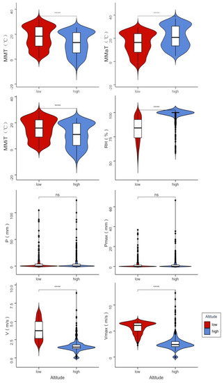 Differences in diurnal variation of eight meteorological factors at low and high altitudes on Lushan Mountain. x axis: two altitudes; y axis: various meteorological factors. MMT: average temperature; MMaT: maximum temperature; MMiT: minimum temperature; P: total precipitation; Pmax: maximum precipitation; V: average wind speed; Vmax: maximum wind speed; RH: relative humidity. **** means p < 0.001; ns means p > 0.05.