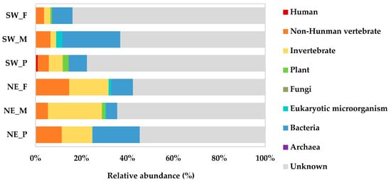 Twenty-four viral families were identified, of which seventeen were dsDNA virus families and seven were ssDNA virus families. As shown in Figure 1, five of the six viromes (all but the SW_M virome) contained a small number of human viruses (0.01%~4.64%) coming from families Circoviridae, Coronaviridae, Genomoviridae, Hepadnaviridae, Herpesviridae, Poxviridae, and Retroviridae. The abundance of human viruses in the SW_P virome (4.64%) was the highest. Agricultural activities might introduce human viruses to the local environment. A moderate quantity of non-human vertebrate (2.70%~18.45%) viruses and invertebrate viruses (1.72%~55.76%) were also detected. These viruses were mainly from the families Circoviridae and Genomoviridae. Animal viruses infecting vertebrates and invertebrates were more abundant in the three NE viromes. Most notably, 72.02% of the viruses in the NE_M virome were classified as animal viruses. The SW_P virome—which originated in paddy soil—had the highest proportion (11.69%) of plant viruses. In contrast, the two viromes from forest soil had the lowest proportion of plant viruses. The representative viral groups were the families Alphasatellitidae and Nanoviridae. Viruses of eukaryotic microorganisms were more common in the NE_F (1.83%) and SW_F (1.91%) viromes. In the other four viromes, all from soil under human activity, less than 0.03% of viruses were annotated as viruses of eukaryotic microorganisms. The percentage of phages ranged between 17.80% and 72.09% in the six viromes. The NE_F (57.30%) and SW_F (72.1%) viromes had higher percentages of phages than the viromes which derived from agricultural soils. The phages mainly belonged to the families Microviridae, Myoviridae, Podoviridae, and Siphoviridae, with a small fragment of Inoviridae also observed. Fungi viruses were only detected in the SW_P virome (1.23%) and the viruses were classified into the Genomoviridae family. This viral group was similar to plant viruses, but Gemycircularvirus and Rhizidiovirus were identified as DNA viruses targeting fungi.