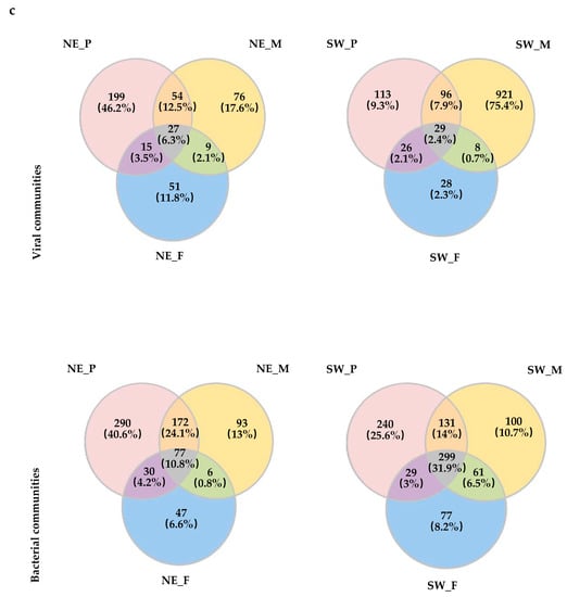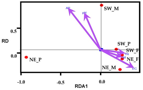 Viral distribution differed between agricultural and forest soils, and the high prevalence of unique viral species found in viromes resulted in a rather low similarity of viral communities (Figure 2). The relative abundance of common species was rather low between agricultural soils, but higher between agricultural and forest soils. The three NE viromes shared seventeen identical viral species. The NE_P and NE_M viromes contained thirty-four of the same species, but there were only ten and six identical viral species between the NE_F virome and the viromes collected from paddy and dryland soils, respectively. The three SW viromes showed a similar trend, with the SW_P and SW_M viromes sharing a relatively higher percentage of identical viral species. SW_F only had thirteen and eight identical viral species with SW_P and SW_M, respectively. The common viral species of the NE viromes and SW viromes were similar, with eleven viral species widespread in the six viromes; they belonged to the families Circoviridae, Cruciviridae, and Microviridae. The Microviridae and Circoviridae families were widespread in the viral communities. The viral species were richer in the SW viromes than in the NE viromes. Distance-based redundancy analysis (db-RDA) with Bray–Curtis distance revealed that biotic and abiotic factors (especially AP) driven by spatial and geographic variation and human activities influenced viral species richness (Figure 3).