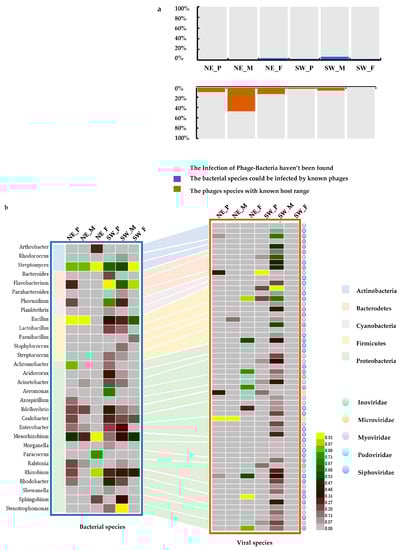 The relationship between bacteria and phages in the six viromes. (a) Proportion of bacterial genera and phage species that have a clear relationship of infection based on Virus–host database. (b) The distribution of bacterial genera and related phages species. On the left is a bacterial heat map and five different colors represent phylum level.