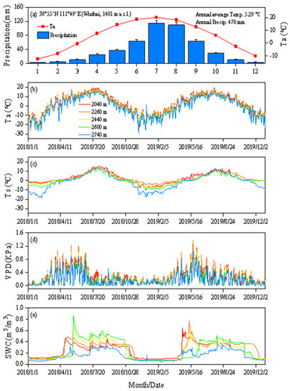 Luya Mountain (38°35’–38°45’ N, 111°50’–112°5’ E), in the Shanxi Province, China, was chosen as the study area. The mean annual air temperature was 5.29 °C and the average annual precipitation was 478 mm from 1957 to 2019 according to the meteorological station in Wuzhai (38°33′ N, 111°29′ E, 1401 m a.s.l.). The annual mean temperature, mean annual precipitation, and annual maximum daily vapor pressure deficit (VPD) have shown an increasing trend since the 1990s [33]. The soil of the forest is sandy loam (depths of 40-95 cm) overlying the fractured parent material. L.principisrupprechtii in this area mainly distributes from 2000 m to 2800 m a.s.l. Moreover, five sites along the altitudinal gradient (2040 m, 2260 m, 2440 m, 2600 m, and 2740 m a.s.l.) were established in Luya Mountain. In this study area, the fluctuations in soil temperature were relatively stable and did not always maintain the same characteristics of change as air temperature, and the soil temperature fluctuation lagged behind that of air temperature, being higher than in the air in winter and lower during summer. The soil temperature was lower than the air temperature from April to mid-August, and the soil temperature was close to the air temperature from mid-August to mid-October. Daily VPD values and variations at all sites were high in spring and early summer, and soil moisture peaked after snowmelt. Sites and tree properties at the five measured sites are shown in Figure 1 and Table 1.