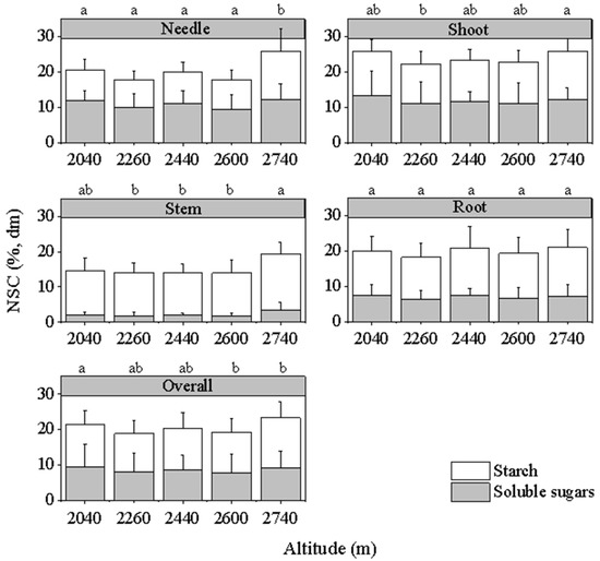 The NSCs and their components (soluble sugars and starch) in all four organs of L. principis-rupprechtii had higher concentrations at the upper and lower altitudes, and other altitudes had similar concentrations in our study area (Figure 2). The NSCs in the needles were higher at 2740 m than those at the other altitudes (p < 0.05). The NSCs in the roots and the soluble sugar–starch ratios in the shoots, stems, and roots were not significantly different among the five altitudes in the study period (p > 0.05; Figure 2 and Table 2), while the soluble sugar–starch ratios in the needles were higher at the lower altitudes than at the higher altitudes.