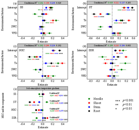 Estimated effects of Ta (air temperature), Ts (soil temperature), SWC (soil water content), and VPD (vapor pressure deficit) on the (a) soluble sugars (SS), (b) starch (ST), (c) NSC, and (d) soluble sugar–starch ratios (SSR) in the needles, shoots, stems, and roots. Moreover, the estimated effects of (e) soil–atmosphere temperature gradient (ΔT = Ta − Ts) on the soluble sugars (SS), starch (ST), NSC, and soluble sugar–starch ratios (SSR) in the needles, shoots, stems, and roots. Conditional R2: induced by both fixed effects and random effects R2.