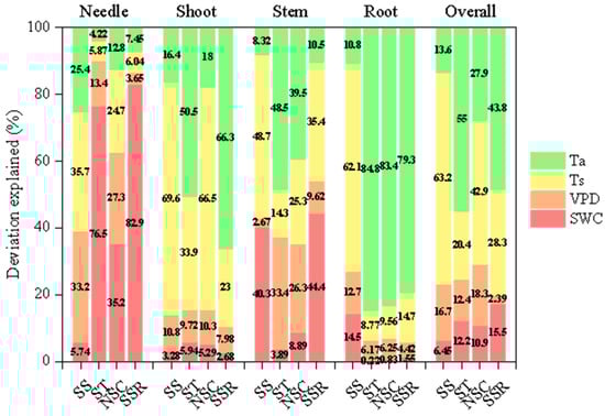Interpretation rate of the environmental variables to soluble sugars (SS), starch (ST), NSC, and soluble sugar–starch ratios (SSR) in different organs based on a linear mixed model.