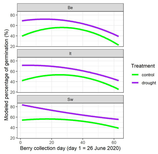 Modeled germination percentages depending on the berry collection day in 2020, on the provenance and on the treatment of the mother plants in 2020. Be: Belgian; It: Italian; Sw: Swedish.