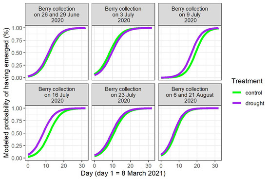 Modeled timing of seedling emergence in the spring of 2021, according to the day of berry collection in 2020 and to the treatment of the mother plants in 2020.