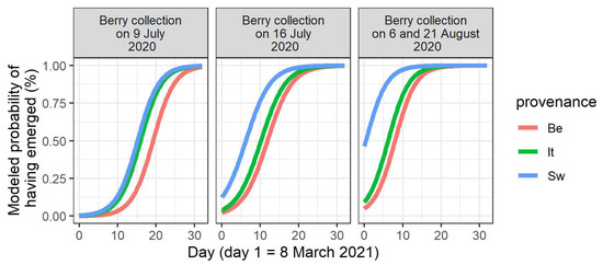 Modeled timing of seedling emergence in the spring of 2021, according to the day of berry collection in 2020 and to the provenance. Only the berry collection days for which a significant provenance effect is present are shown. Be: Belgian, It: Italian, Sw: Swedish.