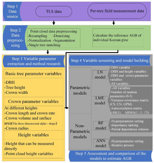 To summarize, TLS as a remote sensing tool has unparalleled capabilities in obtaining detailed individual tree crown structures that conventional methods do not provide. This has contributed additional information to improve the estimation accuracy of individual-tree AGB models. In this study, the overall objective was to develop an individual-tree AGB estimation model based on TLS data by combining point cloud height parameters and crown parameters at different heights to improve the accuracy of planted Korean pine AGB estimation. The specific objectives were as follows: (1) to extract the crown parameters and height parameters from point clouds of 1104 trees, (2) to select variables using stepwise regression and then develop linear (LN), linear mixed-effects (LME), random forest (RF), and artificial neural network (ANN) models for individual-tree AGB estimation, and (3) to compare and analyze the differences in AGB estimates among the four models and identify the most suitable model.