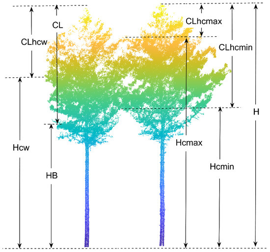Illustration of extracted variables. H is tree height, Hcmin is the minimum contact height, Hcmax is the maximum contact height, HB is the first living branch height, Hcw is the height of the maximum crown width, CLhcmin is the crown length above the minimum contact height, CLhcmax is the crown length above the maximum contact height, CL is crown length, and CLhcw is the crown length above the height of the maximum crown width.