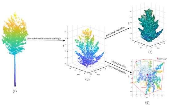Detailed process of crown parameter extraction above different heights; (a) is the complete point cloud for an individual Korean pine, (b) is the crown point cloud above the minimum contact height, (c) is the crown above the minimum contact height reconstructed with the alpha-shape algorithm, and (d) is the crown projection used to calculate the maximum crown radius.