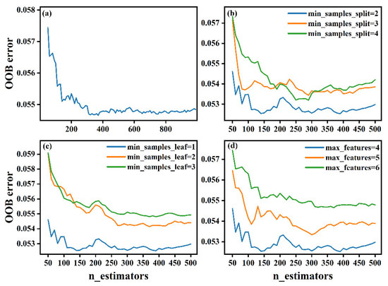 Figure 6a shows the effect of n_estimators on the OOB error; notably, the model yields the minimum OOB error when n_estimators is equal to 390. The effects of min_samples_split, min_samples_leaf, and max_features on the OOB error are shown in Figure 6b–d, respectively. Finally, the optimal hyperparameters of the RF model are chosen as n_estimators = 390, min_samples_split = 2, min_samples_leaf = 1, and max_features = 4.