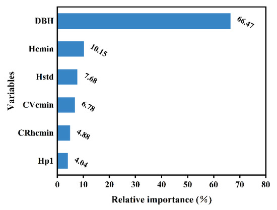 Figure 7 illustrates the relative importance of the effects of each independent variable on the individual-tree AGB. It is obvious that DBH is the primary factor influencing AGB, with a relative importance of 66.47%. Height parameters and crown structure parameters also have some effect on individual-tree AGB, with a total relative importance of 33.53%. The relative importance of each variable in relation to individual-tree AGB is ranked as follows: DBH > Hcmin > Hstd > Cvcmin > Crhcmin > Hp1.