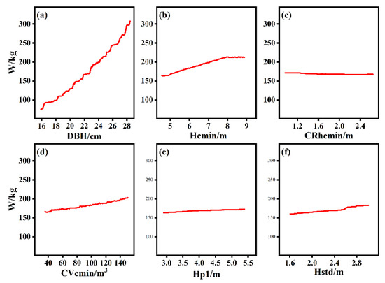 The partial dependence of individual-tree AGB on each independent variable is plotted in Figure 8. There was a strong dependence between individual-tree AGB and DBH, as also observed for the relative importance of variables in Figure 7. Hcmin, Hstd, and Cvcmin also display dependence relations with individual-tree AGB. Additionally, for Crhcmin and Hp1, only very weak dependence relations with AGB are observed, as shown in Figure 8.
