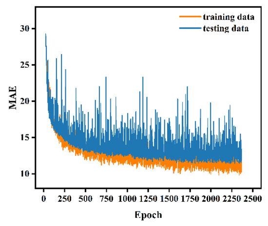 The ANN model was built with the variables DBH, Hcmin, Cvcmin, Hstd, Crhcmin, and Hp1 in the input layer. The variable in the output layer was the individual-tree AGB, the number of neurons in each hidden layer was set to 64, and the layers were fully connected to each other. Other parameters of the model were set as follows: initial learning rate was 0.001, dropout was 0.02, batch size was 32, and maximum number of iterations was 3000. The iterative process of fitting the ANN model is illustrated in Figure 9. Notably, the fitting effect of the model for the training set is not much different than that for the test set, which suggests that no overfitting occurs. Additionally, the model achieves the optimal fitting effect at epoch 2369. The ANN model yields an R2 of 0.969 and an RMSE of 16.161 kg for the training set and an R2 of 0.952 and an RMSE of 15.897 kg for the test set.