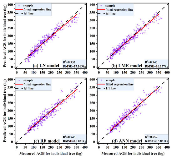 Finally, we compared the ability of the LN, LME, RF, and ANN models to estimate individual-tree AGB. Overall, the predictive ability of the models was ranked as follows: ANN model > RF model > mixed-effects model > linear model. This result demonstrated that the nonparametric models performed better than the other models in individual-tree AGB prediction. Nonparametric models are based on flexible algorithms and have no data structure requirements; thus, they are widely used in forestry. In this paper, both ANN and RF models yielded accurate estimates of individual-tree AGB. The ANN model uses a ‘black box’ operation in the prediction process, but the RF model provides more interpretable results; therefore, we recommend the RF model as the optimal model for estimating individual-tree AGB.