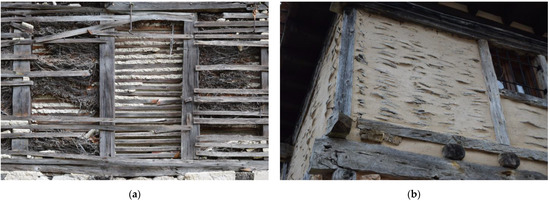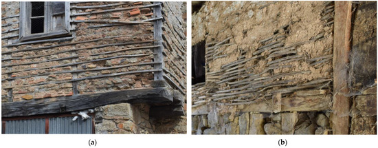 Half-timber walls with lightweight enclosures executed using wooden elements: (a) lath-and-daub enclosure with laths identified as Alnus glutinosa L. in Almagarinos (León); (b) Wattle-and-daub enclosure with flexible rods identified as Corylus avellana L. in Caloca (Cantabria).