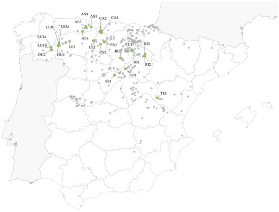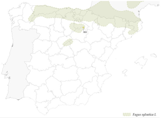 Distribution map of the Fagus sylvatica I. species and location of the case studies identified as belonging to this species. Map drawn up by the authors using information obtained from the database Chorological Data for the Main European Woody Species [42].