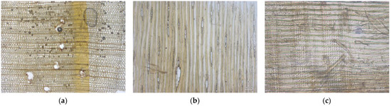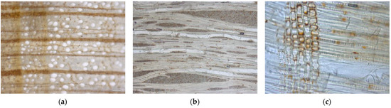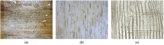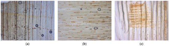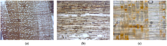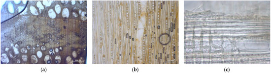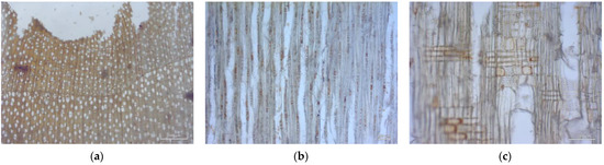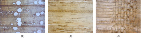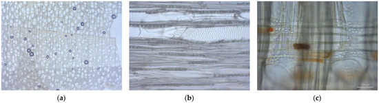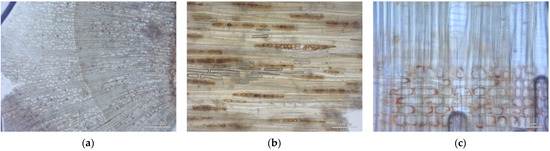 Characteristic sections identified as belonging to the species Pinus pinaster Aiton: (a) Cross-section of sample OU1; (b) Tangential section of sample OU1; (c) Radial section of sample OU2.