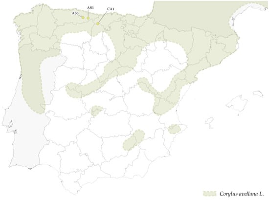Distribution map for the species Corylus avellana L. and location of the cases identified as belonging to this species. Map drawn up by the authors using the information obtained from the database Chorological Data for the Main European Woody Species [42].
