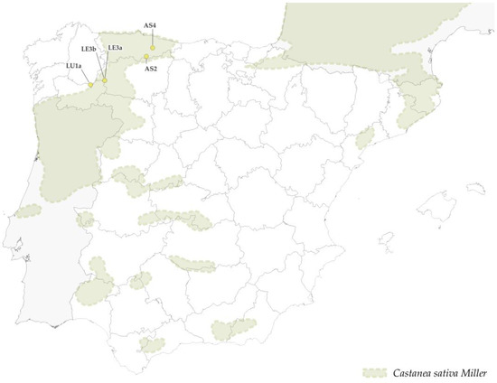 Distribution map of the species Castanea sativa Miller and locations of the case studies identified as belonging to this species. Map drawn up by the authors using information obtained from the database Chorological Data for the Main European Woody Species [42].