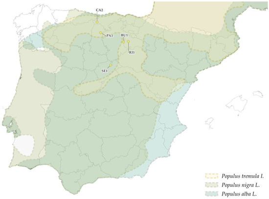 Distribution map of the species Populus tremula I., Populus nigra L., and Populus alba L. and location of the case studies identified as belonging to this group of species. Map drawn up by the authors using information obtained from the database Chorological Data for the Main European Woody Species [42].