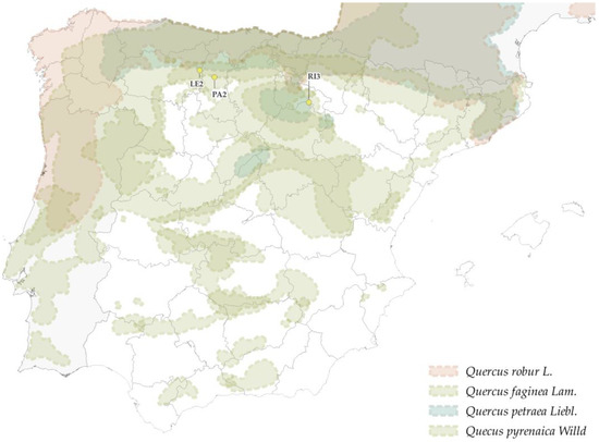Distribution map of the species Quercus robus L., Quercus faginea Lam., Quercus petraea Liebl., and Quercus pirenaica Willd and location of the case studies identified as belonging to this group of species. Map drawn up by the authors using the information obtained from the database Chorological Data for the Main European Woody Species [42].